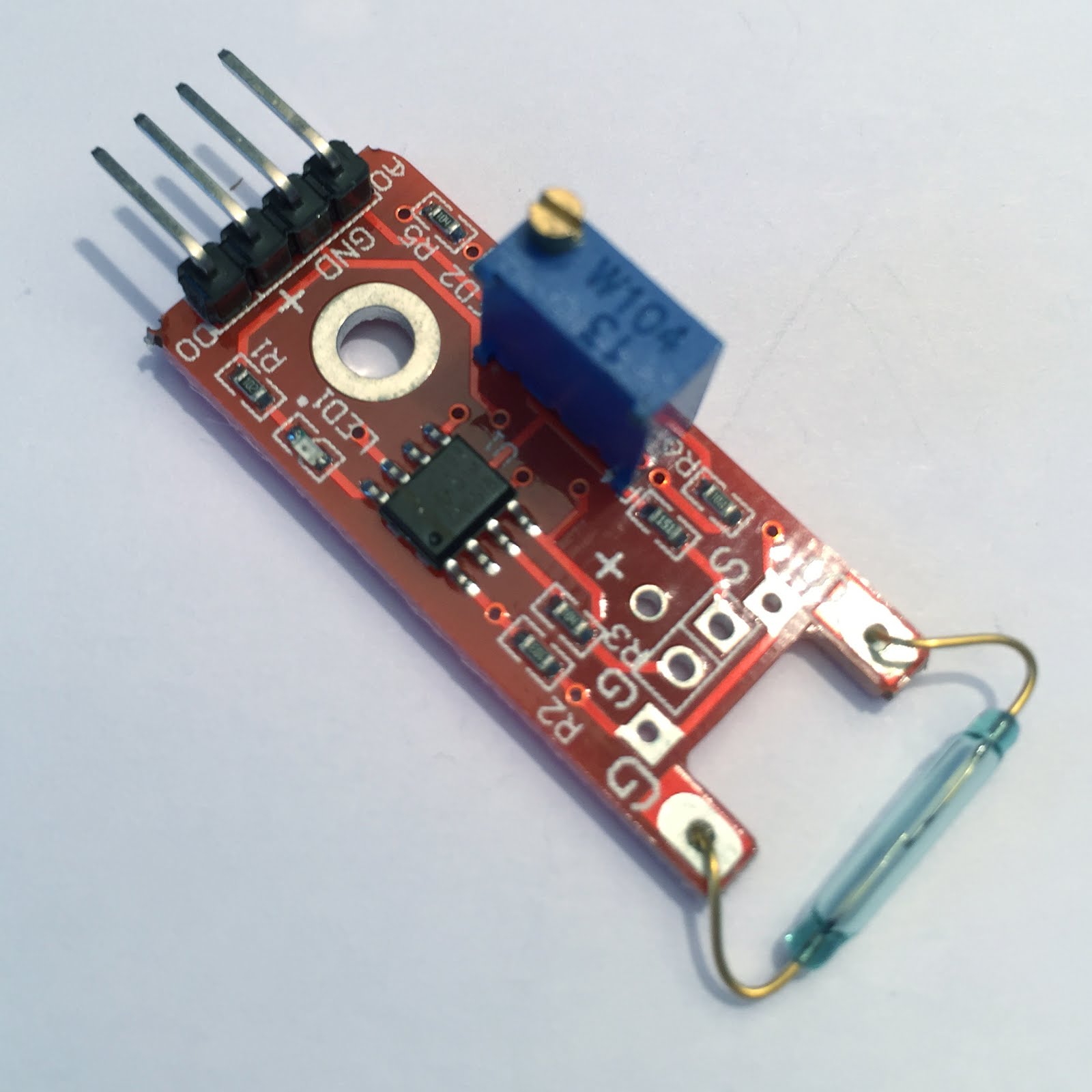 Basato sul contatto Reed (qui piu' informazioni) questo modulo fornisce un valore logico sul suo piedino digitale d'uscita D0 in funzione della presenza o meno di un campo magnetico.