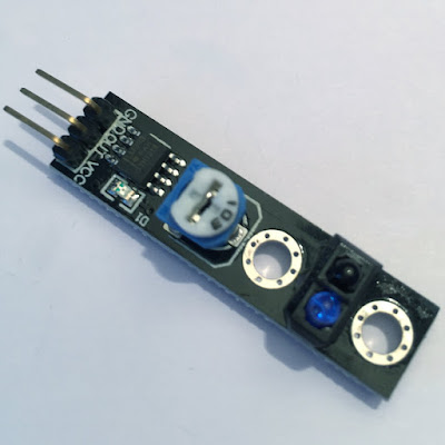 Questo modulo e' composto da una coppia di un led emettitore ad infrarossi e un ricevitore ad infrarossi. In pratica il led ad infrarossi emette un fascio di luce (non visibile ad occhio nudo) che puo' essere riflesso od assorbito in funzione della superfice su cui e' puntato.